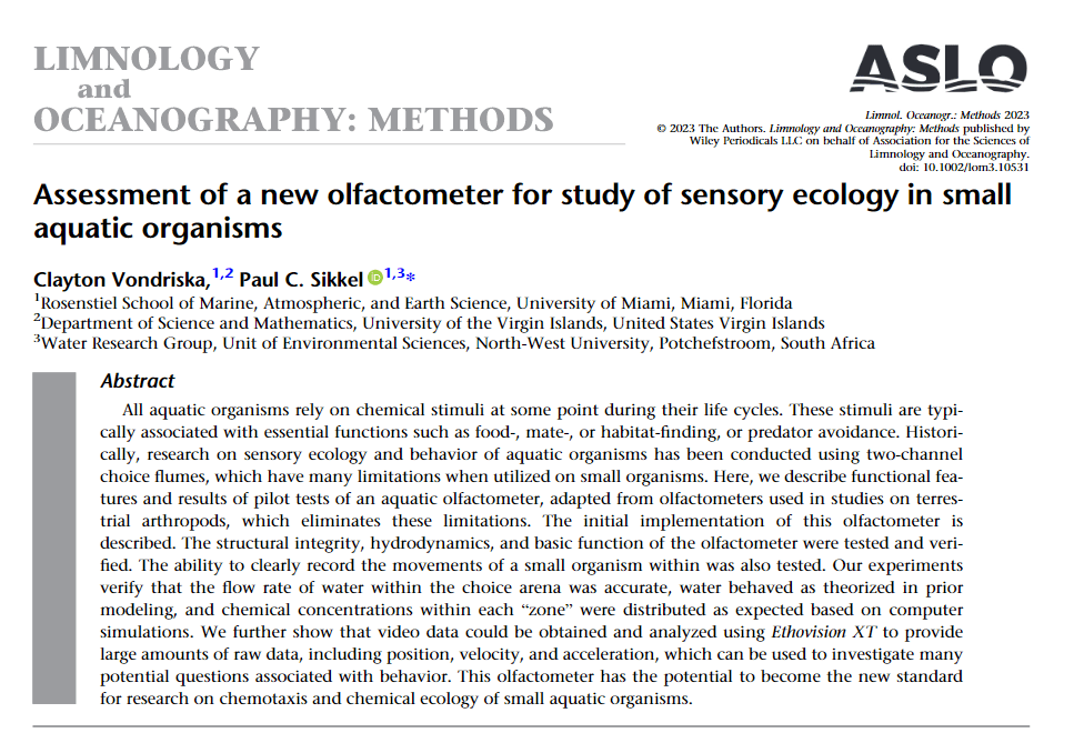 Hot off the press! The latest publication to come out of Gnathiid Gnation is the first from Ph.D. candidate Clayton Vondriska‘s dissertation research! The paper “Assessment of a new olfactometer for study of sensory ecology in small aquatic organisms” is an Open Access paper available in Limnology & Oceanography: Methods. The paper can be accessed at: https://doi.org/10.1002/lom3.10531